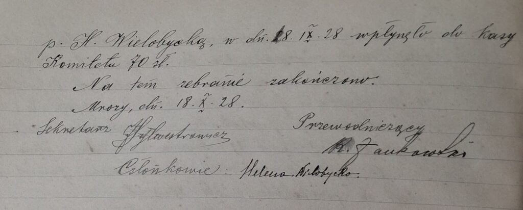 W 1939 roku nadeszła wojna i wszystko się skończyło. Pani Wielobycka już wtedy była sama i nie miała środków do życia. Przeprowadziła się do domu p. Gogłozy. Na rogu w sionce miała sklepik. Sama piekła ciastka drożdżowe, bułeczki, ciągała je w blasze na sznurku, by była niesprawna. I sprzedawała je. To była straszna rzecz. I pomyśleć, ile ta kobieta dla Mrozów zrobiła. Ile ona dobrego dla nas zrobiła. Dzięki niej nasz horyzont myślowy był inny. Każdy miał cel w życiu, obowiązek, który przydał się na całe życie. Ona była duszą całego społeczeństwa. Jak z perspektywy lat myślę, co ta kobieta miała za to wszystko, za swoją wspaniałą pracę? Myśmy powinni jej pomnik postawić. To była fenomenalna kobieta. Nie było chętnego, kto by się nią zajął. Owszem, później uczyniła to p. Kamińska – oddana opiekunka wielu samotnych i chorych ludzi. Chodziła do pani Wielobyckiej, kąpała ją, przebierała a później to już została zupełnie sama.”