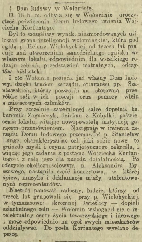 W 1921 roku doprowadziła do otwarcia domu ludowego im. Wojciecha Korfantego w Wołominie. Jak donosił Kurier Warszawski nr 352 z 21 grudnia 1921 roku o otwarcie tego domu zabiegała wołomińska inteligencja pod egidą p. Heleny Wielobyckiej. Grupa inicjatywna od trzech lat pracowała nad utworzeniem samodzielnego ogniska we własnym lokalu, odpowiednim dla wszelkiego rodzaju zebrań, przedstawień teatralnych, odczytów, biblioteki.