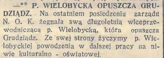Następnym przystankiem w życiu państwa Wielobyckich był Grudziądz. Nie wiemy, z jakich powodów. Na pewno w Grudziądzu Helena Wielobycka posiadała własny dom, co zostało odnotowane w różnych dokumentach, między innymi w protokołach Komitetu Budowy Kaplicy w Mrozach, którego była członkiem. W Grudziądzu pani Helena również dała się poznać jako aktywna animatorka życia kulturalno-oświatowego. Jej działalność musiała być bardzo widoczna, gdyż w numerze 254 z 4 listopada 1926 roku gazety „Głos Pomorski” została opublikowana wzmianka, że p. Wielobycka opuszcza Grudziądz i żegna się z Narodową Organizacją Kobiet, której wiele lat przewodziła. Dodatkowo we wzmiance znalazły się życzenia powodzenia w dalszej pracy na niwie kulturalno-oświatowej.